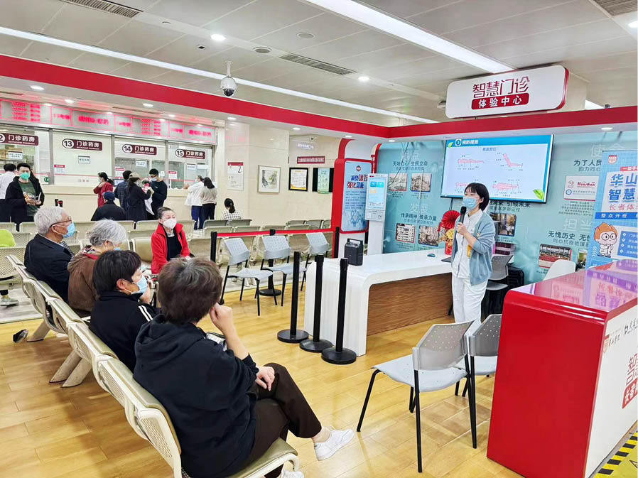 在推進新技術(shù)應(yīng)用的同時,華山醫(yī)院充分考慮到目前還不能熟練使用智能設(shè)備的老年患者。在華山醫(yī)院門診二樓,每天都有公益性的課程,志愿者手把手教患者熟悉醫(yī)院看病流程,幫助老年患者方便就醫(yī)。